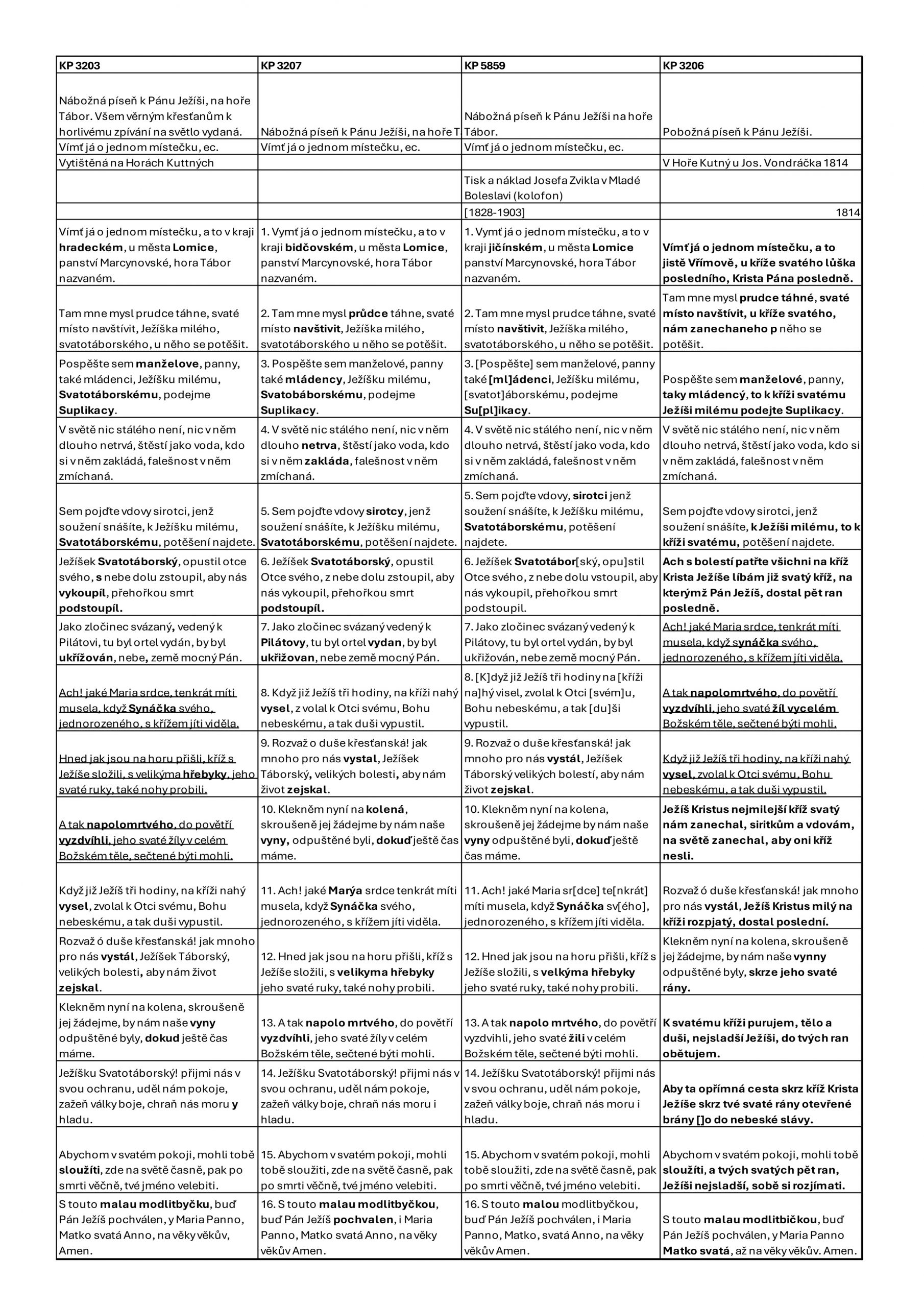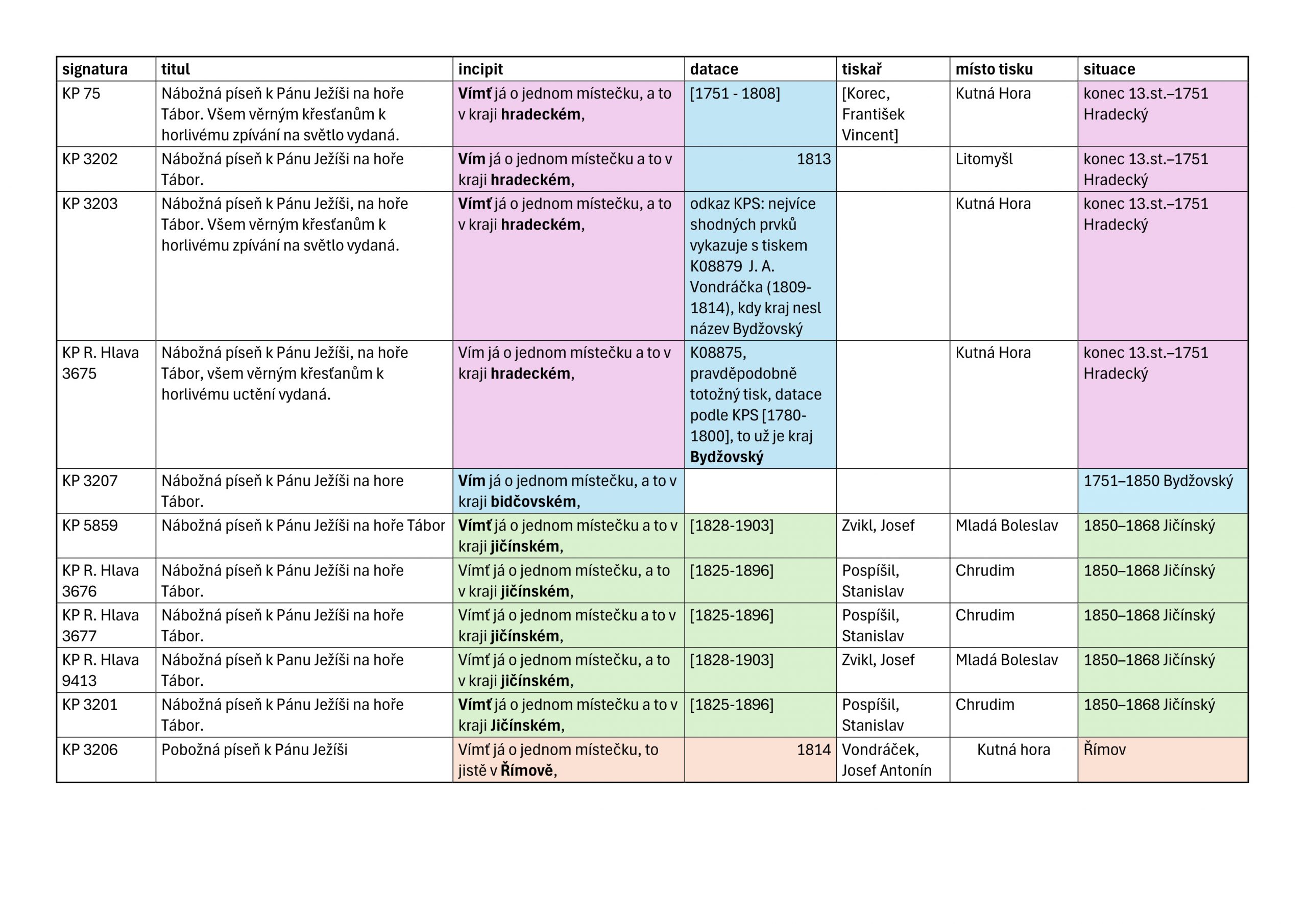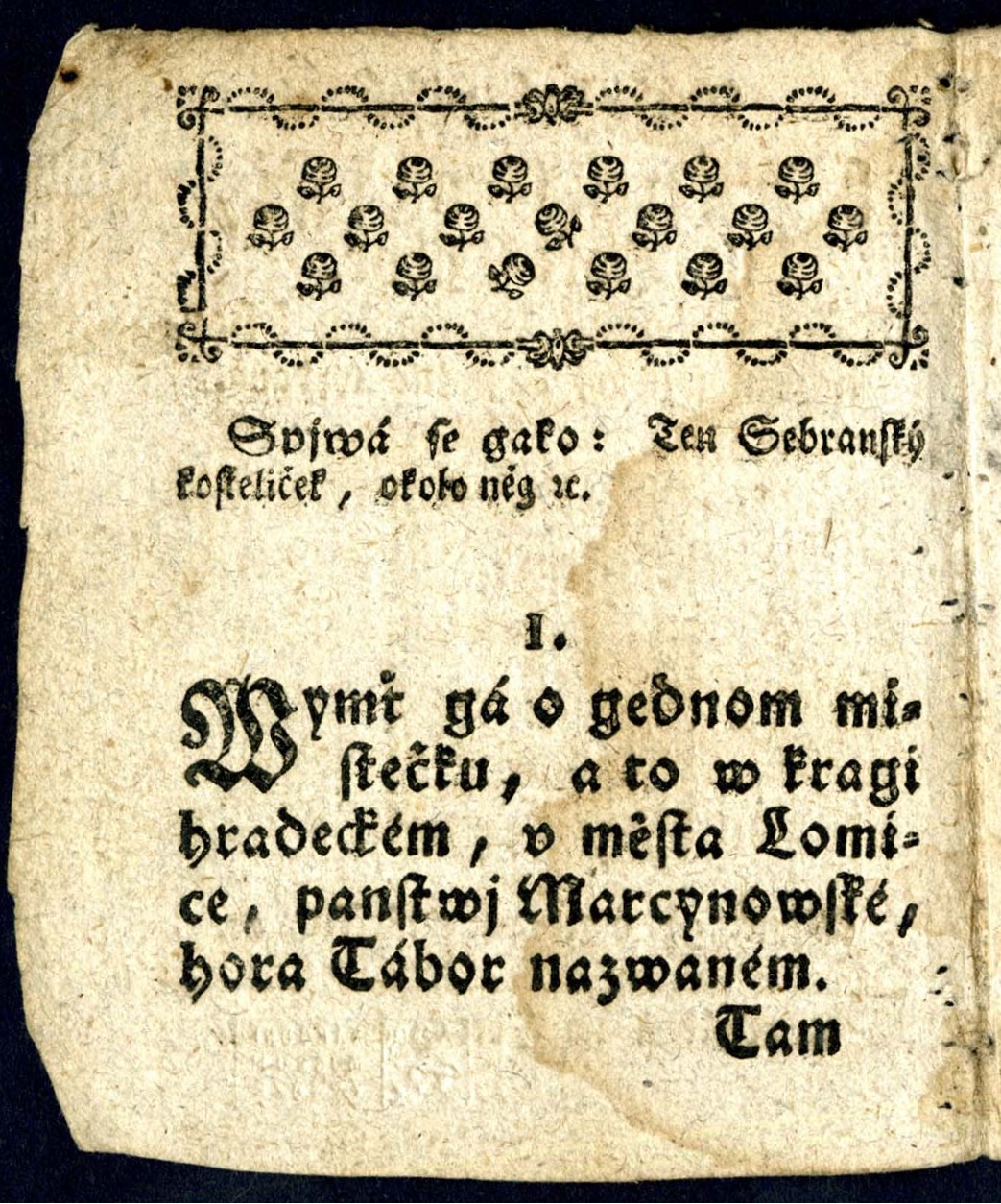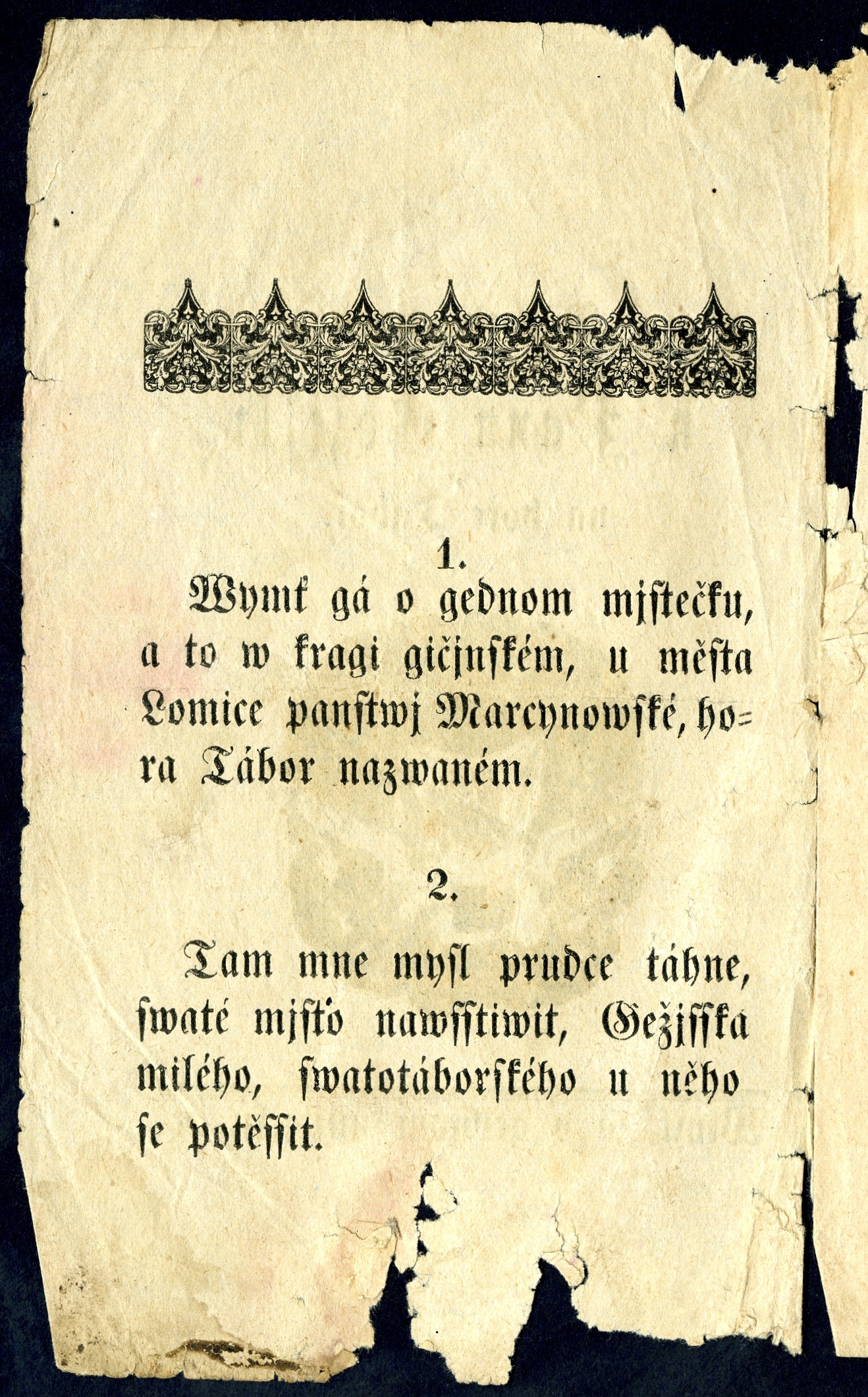 Soubor 16 tisků se stejným incipitem „Vímť já o jednom místečku…“, vztahujících se k Ježíši Táborskému, vykazuje odchylky v geohistorické adaptaci pojmenování kraje, v němž se poutní místo hora Tábor blízko Lomnice nad Popelkou. nachází.